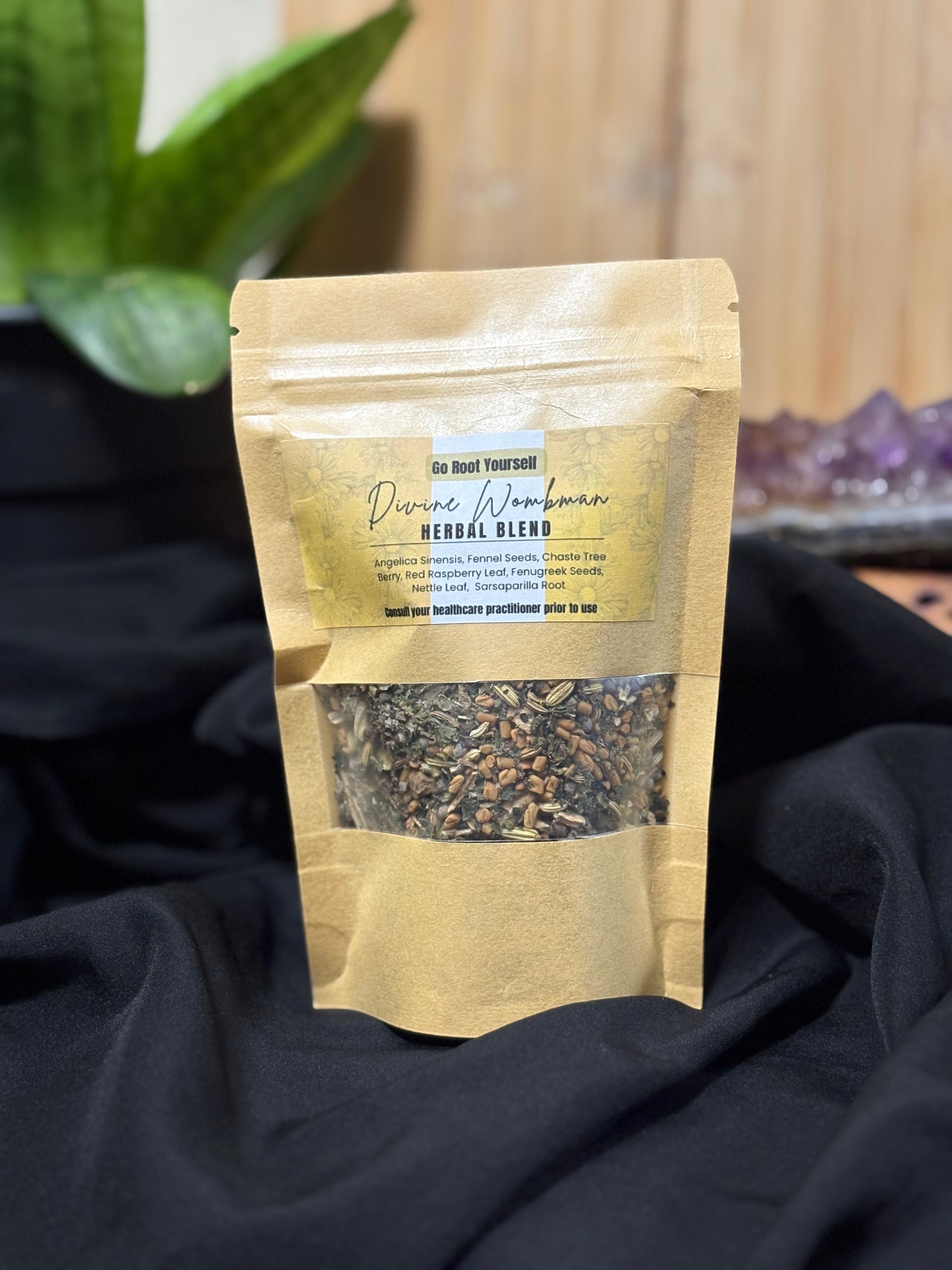 Divine WOMBMAN Tea is an all-natural blend of chaste tree berries, red raspberry leaf, Angelica root,Fennel seeds, fenugreek seeds, and nettle leaf. Regulate your hormones, ease PMS, improve fertility, and fight acne while nourishing your body with essential vitamins and minerals. Empower yourself with this powerful tea.